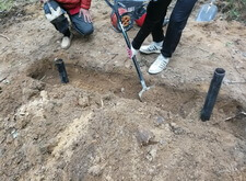На данном участке изначально присутствовал только простой бетонный памятник и металлическое ограждение. Нам же необходимо было привести территорию могилы в полный порядок. Приступая к работе, мы первым делом вкручиваем определяющие фундамент сваи.
