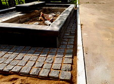 Приступаем к работе с цветниками. Один уже был в наличии, поэтому делаем второй, идентичный. По проекту цветники должны смотреться одинаково даже несмотря на то, что памятники будут разные. В это же время укладываем гранитную брусчатку уже на территорию места захоронения.