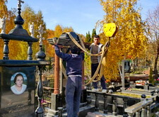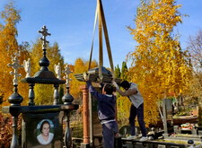 Начинается процесс монтажа. Доставляем памятники, крепим их, приклеиваем и насаживаем на штыри все конструктивные элементы надгробий.
